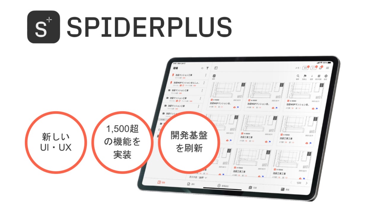 スパイダープラス株式会社(東京都港区、代表取締役社長:伊藤謙自、証券コード:4192 東証グロース)では、8月1日(月)より、自社で開発提供する建設DXアプリ「リニューアル版SPIDERPLUS(スパイダープラス)」の販売受付を開始する予定であることをお知らせいたします。提供プランや詳細な機能、具体的なお申込方法については、7月中旬を目途にお知らせする見込みです。