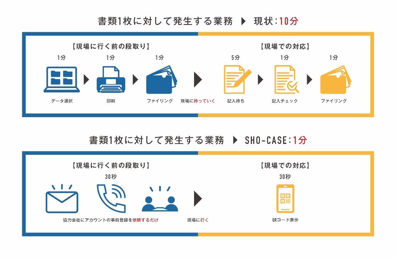 現在、現場作業員は新しい現場に入るたびに紙で個人情報を提出し、管理者がその紙をファイルなどに入れて管理しています。「SHO-CASE」を利用することで、1回の情報登録で済み、より高度なデータ管理が可能となります。