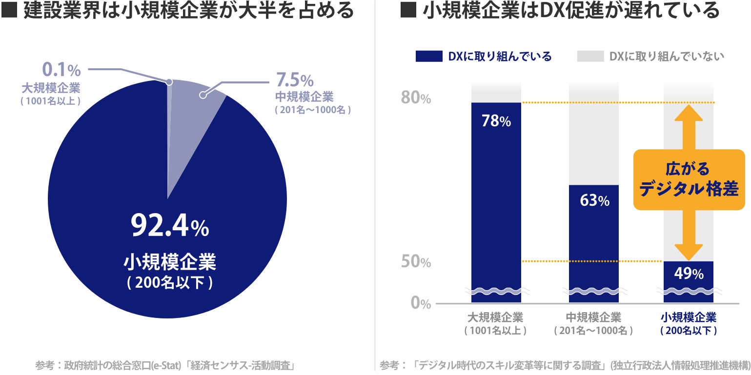 2019年4月の労働基準法改正によって追加された労働時間の上限規制。適用まで5年間の猶予を与えられていた建設業界も残すところ21ヶ月となり、今まさに建設DXが注目されています。しかし小規模企業が92.4%※を占める建設業界においては、ITソリューションの導入ハードルが高く、ゼネコンと協力会社との間でデジタル格差が生まれ始めています。