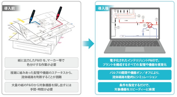従来のP&IDに代わり「マウス操作で流体の流れをカンタンにシミュレーションできる」「P&IDから散在する様々な情報へカンタンにアクセスできる」というフィールド業務改革のコンセプトを継承し、お客さまからの要望が多かった“紙やCAD図面からインテリジェントP&IDへのカンタンな移行”を独自のAI技術で実現し、さらにユーザインターフェースの刷新でユーザビリティが大幅に向上します。