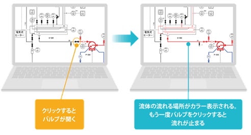 インテリジェントP&ID上でバルブ開閉やポンプON/OFFを切り替えると、「Dynamic Flow Navi」が流体経路を自動判定してカラー表示します。流体の種類によって特定の色を指定しておくことで、よりプラントの状態が正確に把握できます。ステータスを変えた流体経路パターンを複数保存し、プラントの運用・保全用の技術情報として活用することもできます。