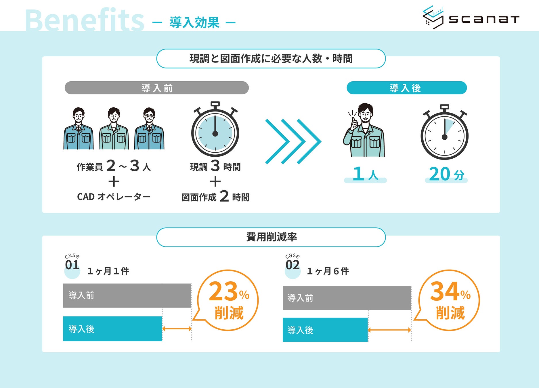 (*)当社調べ。現場監督、助手、現地調査スタッフ、CADオペレーターの人件費はそれぞれ3万円、2万円、2万円、4千円として試算。スキャンする対象物により値は変動いたします。