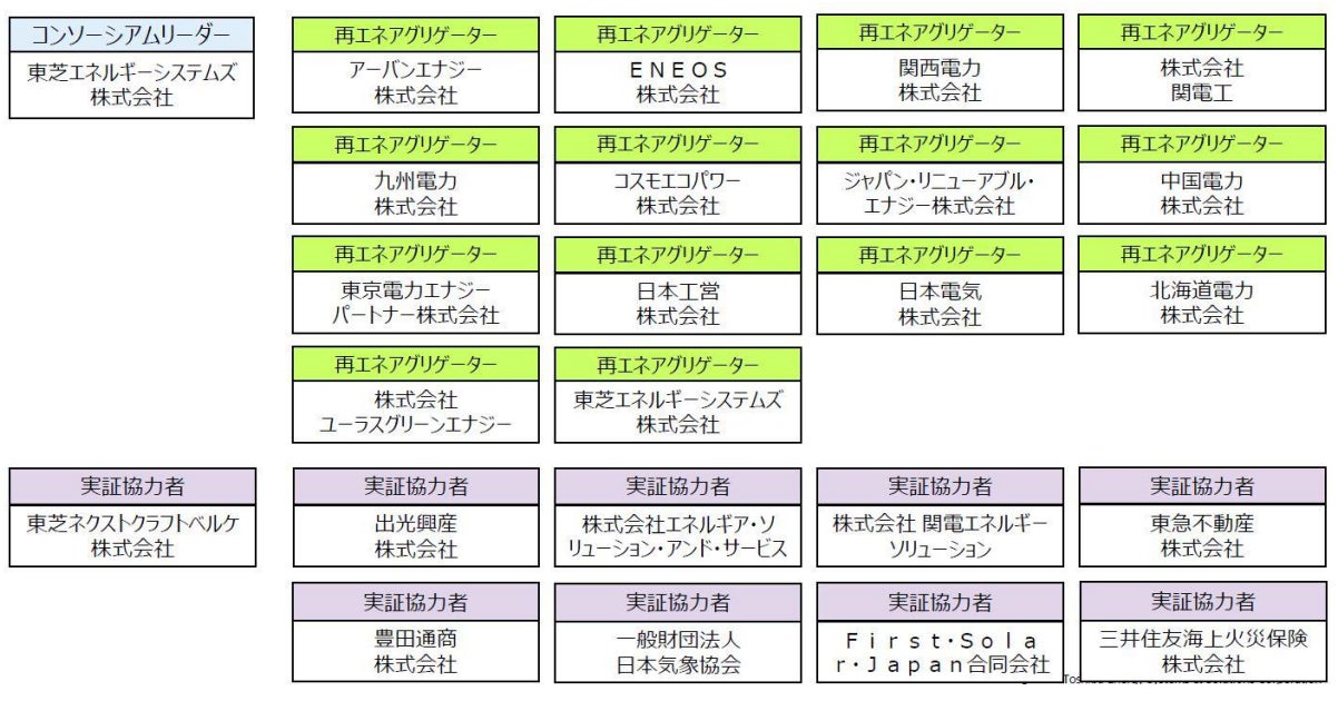 実証協力者:東芝ネクストクラフトベルケ株式会社、出光興産株式会社、株式会社エネルギア・ソリューション・アンド・サービス、株式会社関電エネルギーソリューション、東急不動産株式会社、豊田通商株式会社、一般財団法人日本気象協会、First・Solar・Japan合同会社、三井住友海上火災保険株式会社