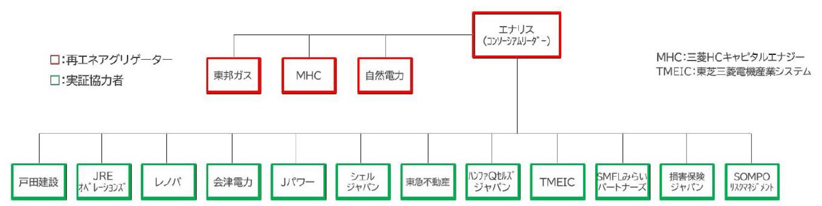 実証協力者:戸田建設株式会社、JREオペレーションズ株式会社、株式会社レノバ、会津電力株式会社、電源開発株式会社(Jパワー)、東急不動産株式会社、シェルジャパン株式会社、ハンファQセルズジャパン株式会社、東芝三菱電機産業システム株式会社、SMFLみらいパートナーズ株式会社、損害保険ジャパン株式会社、SOMPOリスクマネジメント株式会社