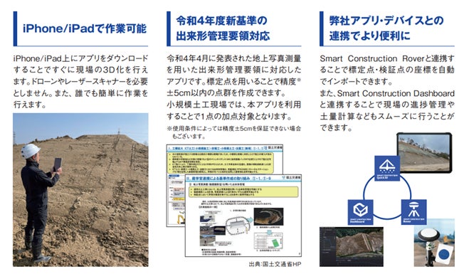 本アプリは、LiDARスキャナ搭載のスマートフォンやタブレット※1にインストールして測定対象範囲を撮影するだけで、LiDARスキャナで取得した点群データや撮影した写真から、国土交通省の「3次元計測技術を用いた出来形管理要領(案)」に準拠した※2高精度な計測点群データを生成することができるものです。