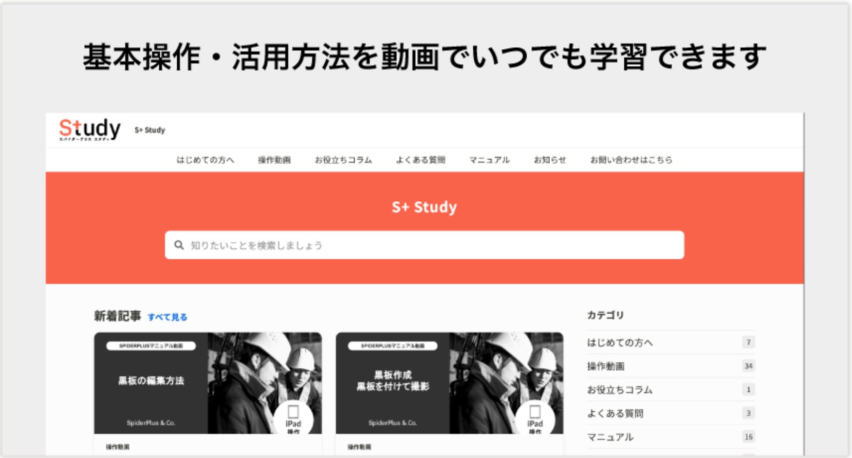 - SPIDERPLUSの基本操作や活用法について、空いた時間にいつでも学習できる