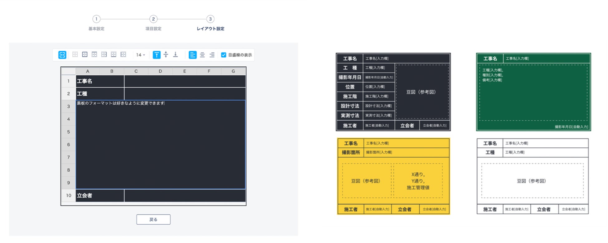 左:黒板フォーマット作成画面 右:作成できる黒板の一例
