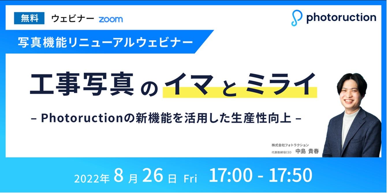 2022年8月26日に写真管理に関する特別ウェビナーを実施いたします。今回のリニューアルの内容も含め、当社代表取締役の中島から工事写真やPhotoructionに関する情報をお話しさせていただきます。