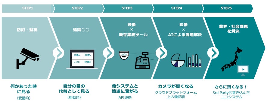 セーフィーでは図の5つのステップを提唱しています。防犯などの目的で導入済みのカメラをクラウドカメラに置き換えることで、現場の「見える化」から「データ活用」までの全体像を描いています。今回の取り組みでは、STEP1、STEP2、STEP4を実現しています。