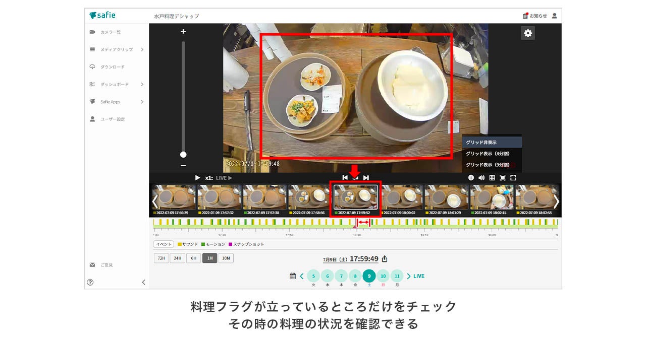 これまでは、通常時・混雑時を含むオペレーションの全容が可視化されておらず、エリア責任者が都度の臨店で現場状況を把握、もしくは、店長が終業後に写真で報告する状態でした。Safieのカメラ設置により、映像を「第三の目」として全容可視化、振り返りに活用することで、料理の品質管理における課題(混雑時の人員配置やオペレーション内容)、改善すべきポイントを具体的に把握することができました。