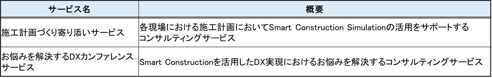 また、Smart Construction Simulation を安心してお使いいただくため、EARTHBRAINの各代理店を通じて、各現場における施工計画においてSmart Construction Simulationの活用をサポートするコンサルティングサービス「施工計画づくり寄り添いサービス」を本日から提供開始いたします。また、本サービスのご契約者さまは、Smart Constructionを活用したDX実現におけるお悩みを解決する「DXカンファレンスサービス」もご利用いただけます。