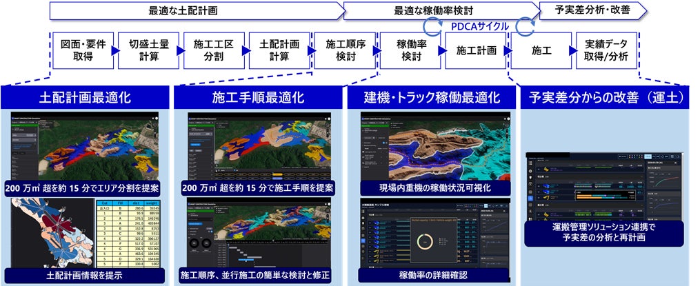 本サービスは、クラウド上に3次元の設計データと地形データ※2を登録し、工期や機械編成などの施工条件を入力することにより、最適な土配計画や施工手順、建機の稼働率を算出し、現場のデジタルツイン上で精度の高い施工計画を短時間で実現するものです。生産性を最大限に高めるため、登録した3次元データから、運搬土量が最小になるように切り土量および盛り土量を自動で計算します。その後、AI技術を活用し、最適な土配計画のためのエリア分割、工事進行に伴い変化する地形、ダンプの走行可能勾配と最短ルートを考慮した最適な施工手順、次の工程で利用する建機との最適な連携タイミングを考慮した上での稼働率を算出し、最短工期での施工計画を立案します。算出した結果は、工程表と連動したグラフやアニメーションで表示され、地形の変化や建機の動き、作業量を視覚的に確認することが可能となります。