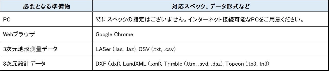 ※2 本サービスは、LASer、CSVなどの拡張子で作成された3次元地形測量データ、DXF (.dxf)、LandXML (.xml)などの拡張子で作成された3次元設計データがご利用いただけます。