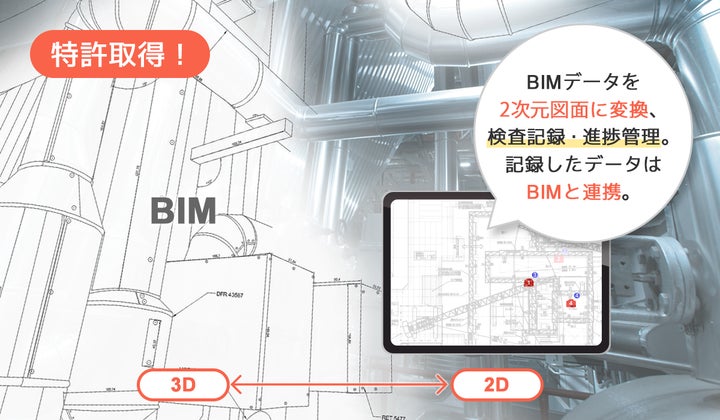 建設業界では、官民一体となって3次元モデルで施工管理を行う手段の検証・検討が進んでいます。しかしながら、検査記録などの現場業務においては、3次元モデルのBIMのままでは直感的な施工管理が難しいため、2次元の建築図面に変換したうえでの施工管理が根強く求められておりました。