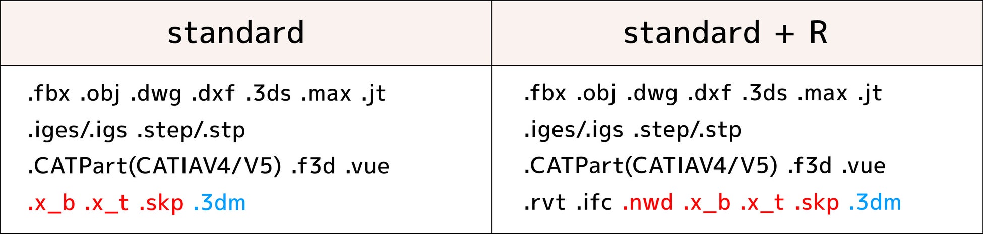 今回追加されたファイル形式のうち、「.x_b」、「.x_t」、「.skp」、「.3dm」はすべてのプランで変換が可能になります。「.nwd」はstandard+Rのみの対応になります。なお、mixpaceの全ての機能を30日間お試しいただけるstarterプランもあります。