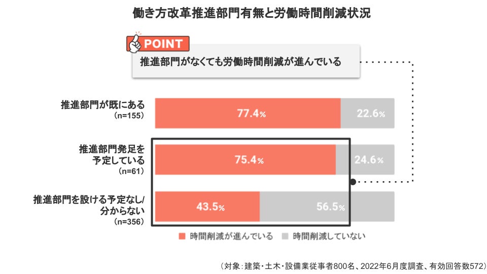 ただその一方で「推進部門を設ける予定がない/分からない」を選んだ回答者は43.5%が労働時間削減が進んでいる、と回答しています。「推進部門が既にある」「発足を予定している」グループとは30%以上の差があるものの、前述の43.5%は決して小さな割合ではありません。