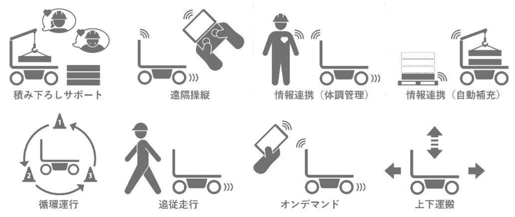 自律走行ロボットには、追従走行、オンデマンド、循環走行、遠隔操縦などの機能を実装します。これらの技術により、「必要な資材・装備、検査機器、廃材等」を、「都度人が運ぶ」という「筋力やその持久力を前提とした現場」から、「都度自律走行ロボットが運ぶ」という「手ぶら・軽々を前提とした現場」へのトランスフォーメーションを推進します。